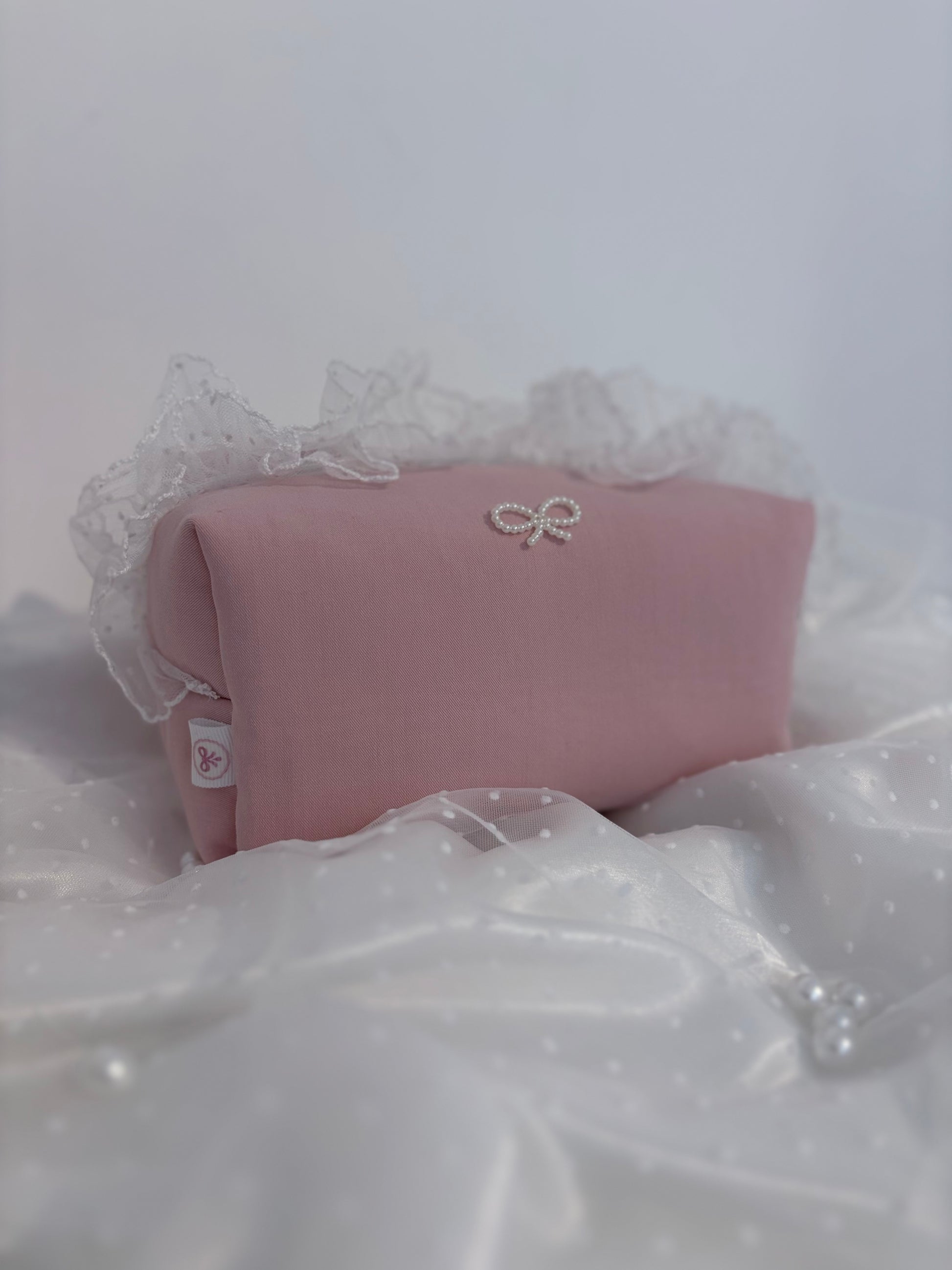 âą Tissu : extĂ©rieur en coton rose poudrĂ©, dĂ©corĂ© dâun nĆud de perles et de dentelle blanche vaporeuse