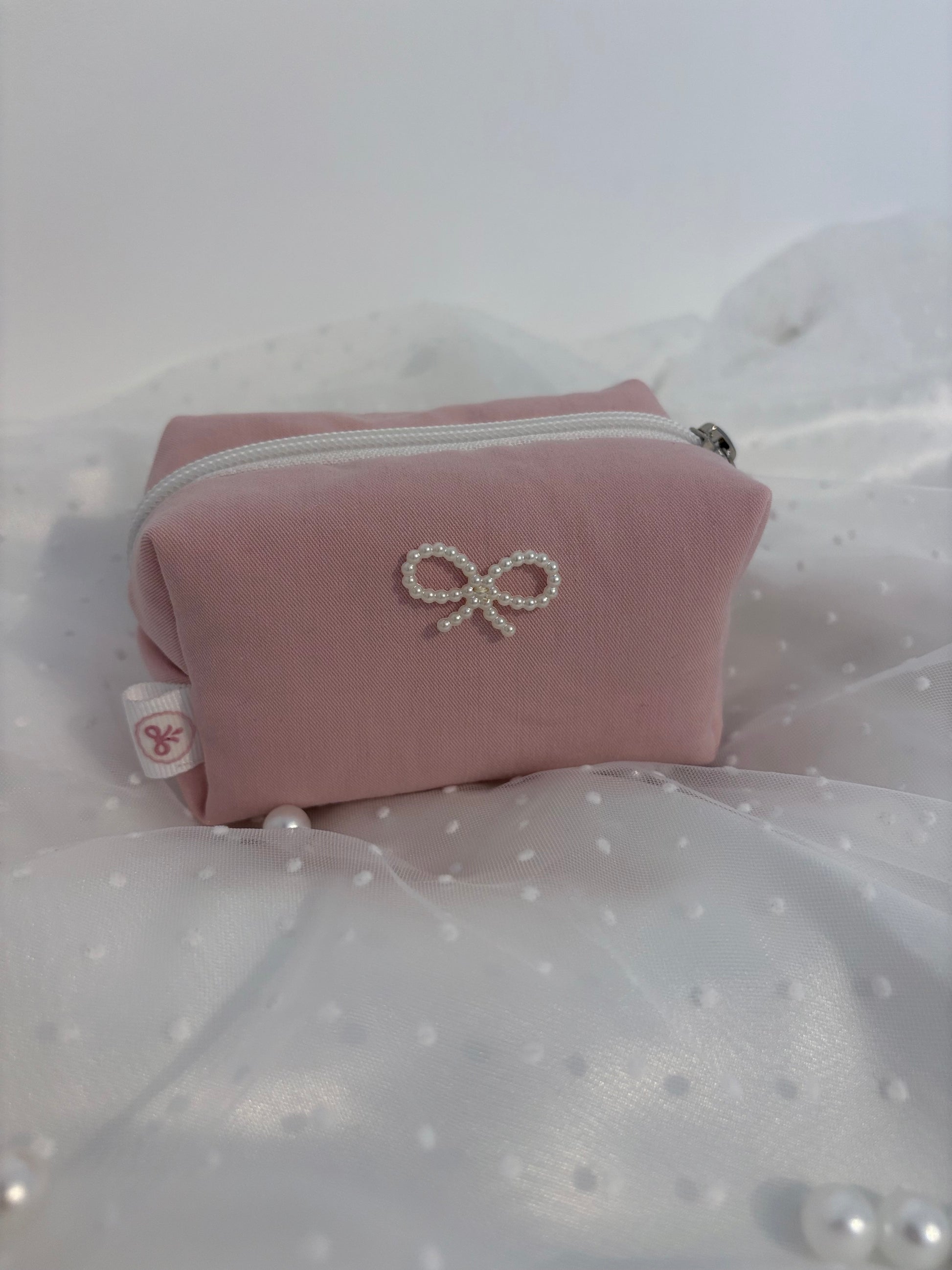 âą Tissu : extĂ©rieur en coton rose poudrĂ©, dĂ©corĂ© dâun nĆud de perles