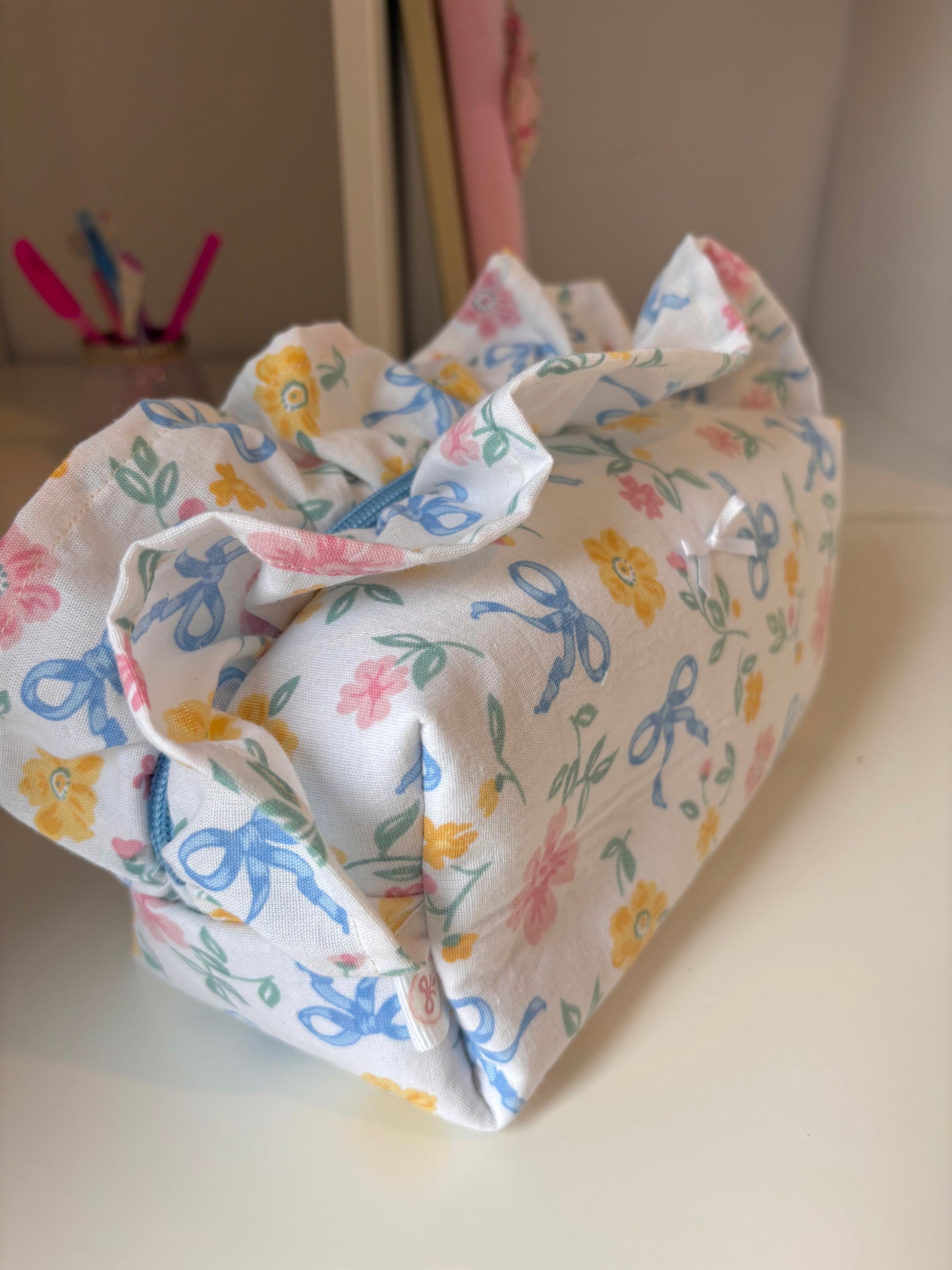 Tissu : extérieur fleuri à rubans bleus et roses, doublure bleu ciel
