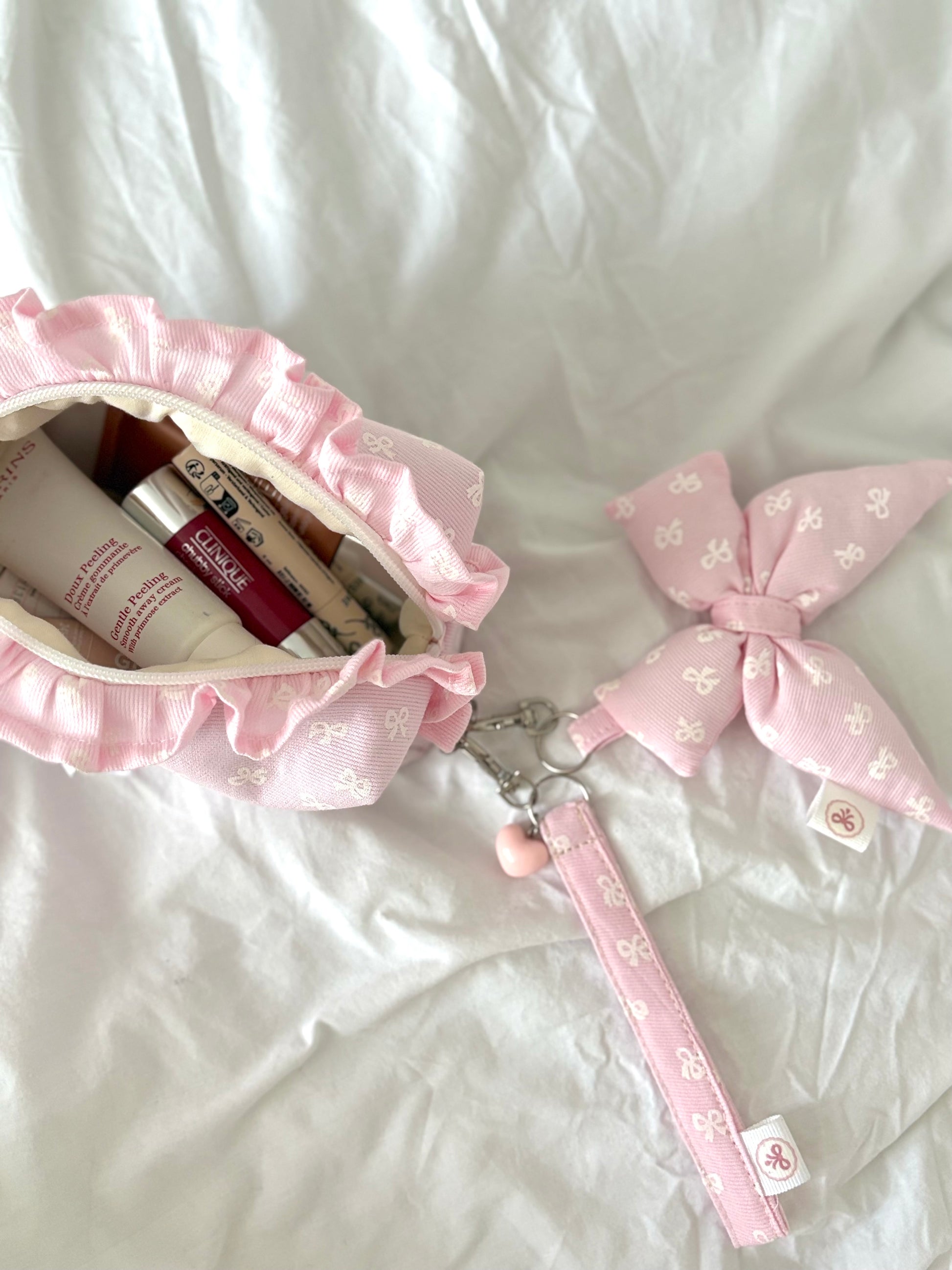 • Tissu : extérieur en coton gaufré rose à petits nœuds blancs, doublure unie jaune pâle