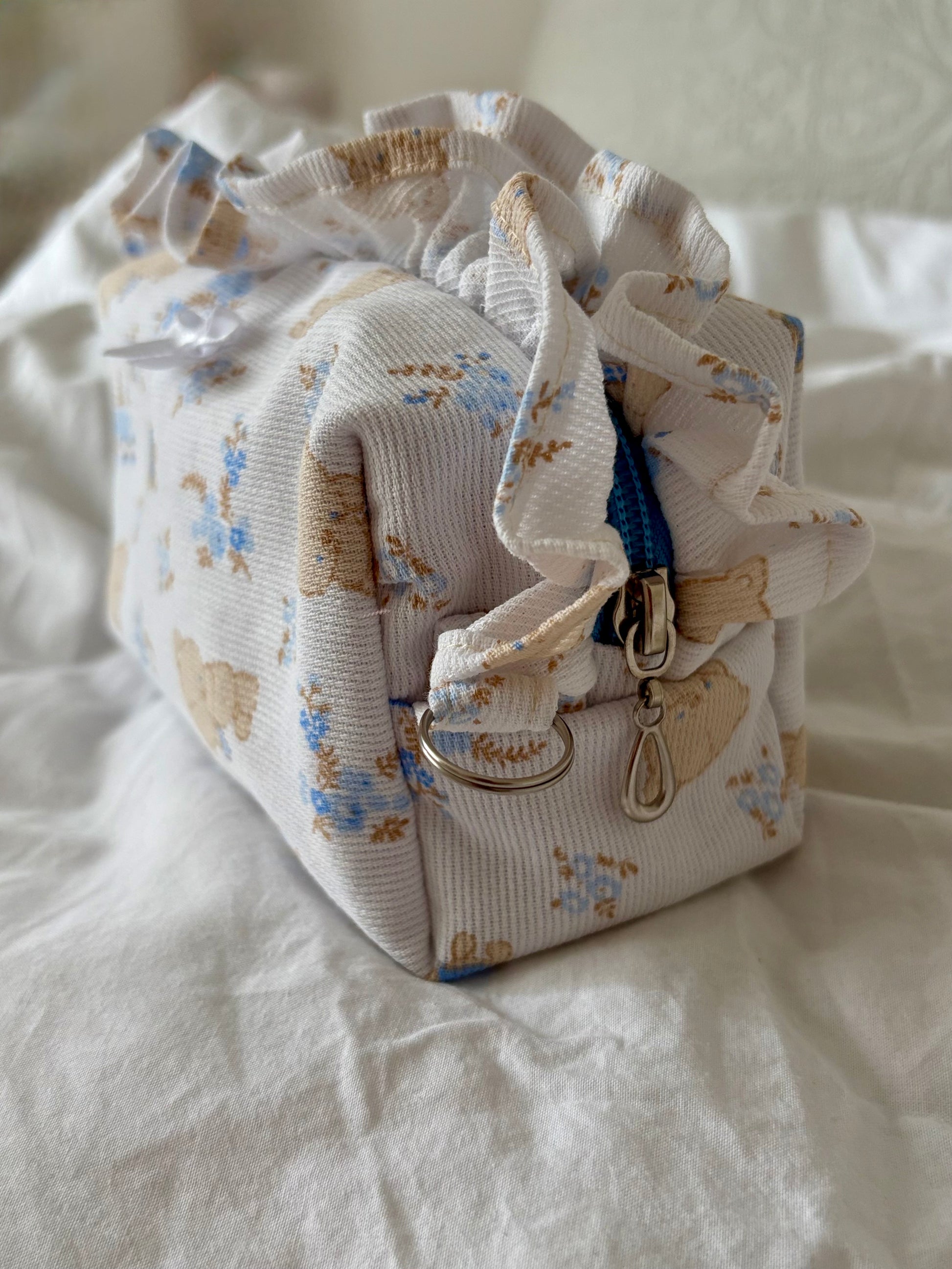 Le tissu à petits oursons beiges et fleurettes bleues s’associe à une doublure crème pour une capsule chaleureuse.