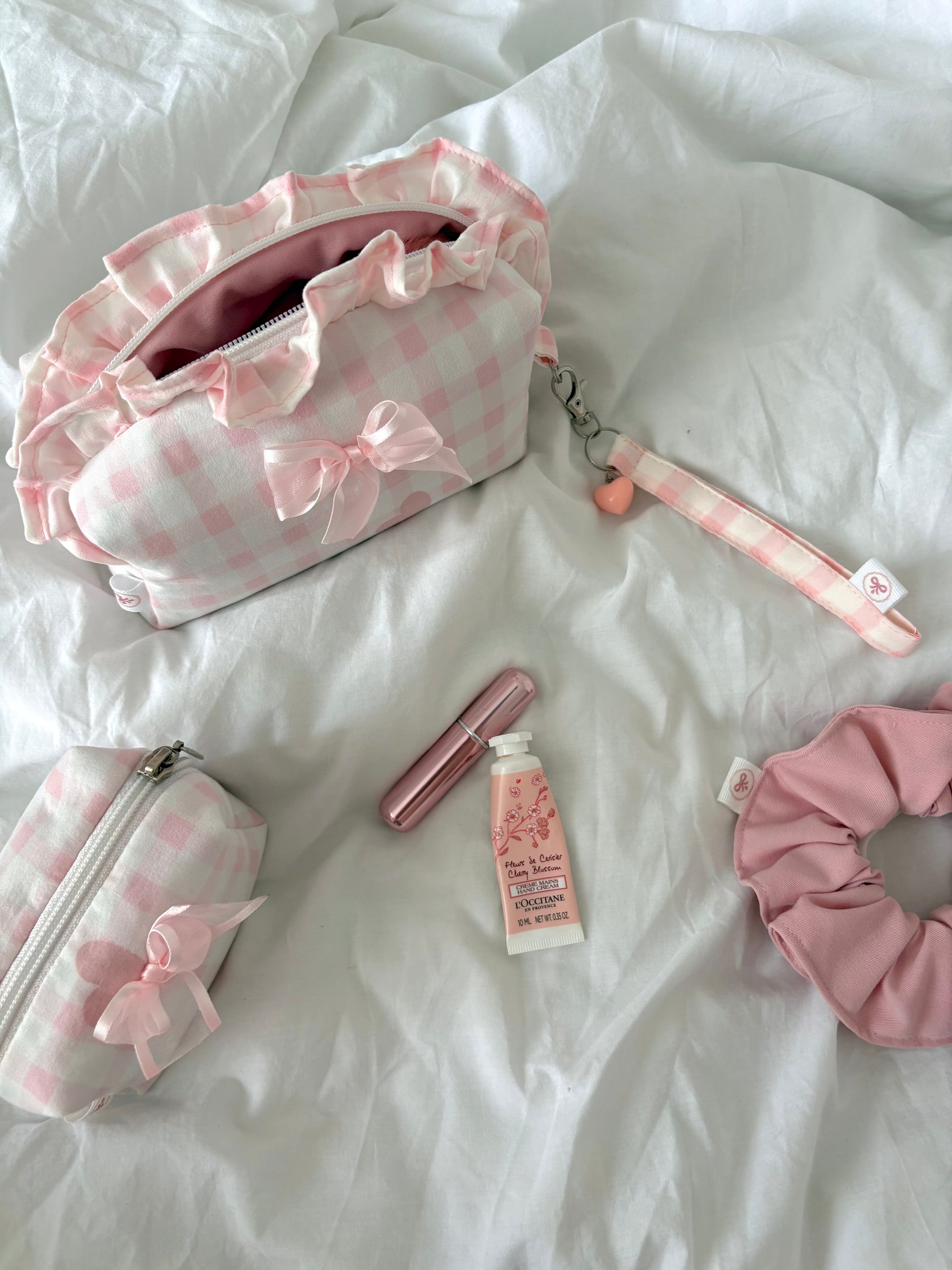 • Tissu : extérieur vichy cœurs rose, doublure rose