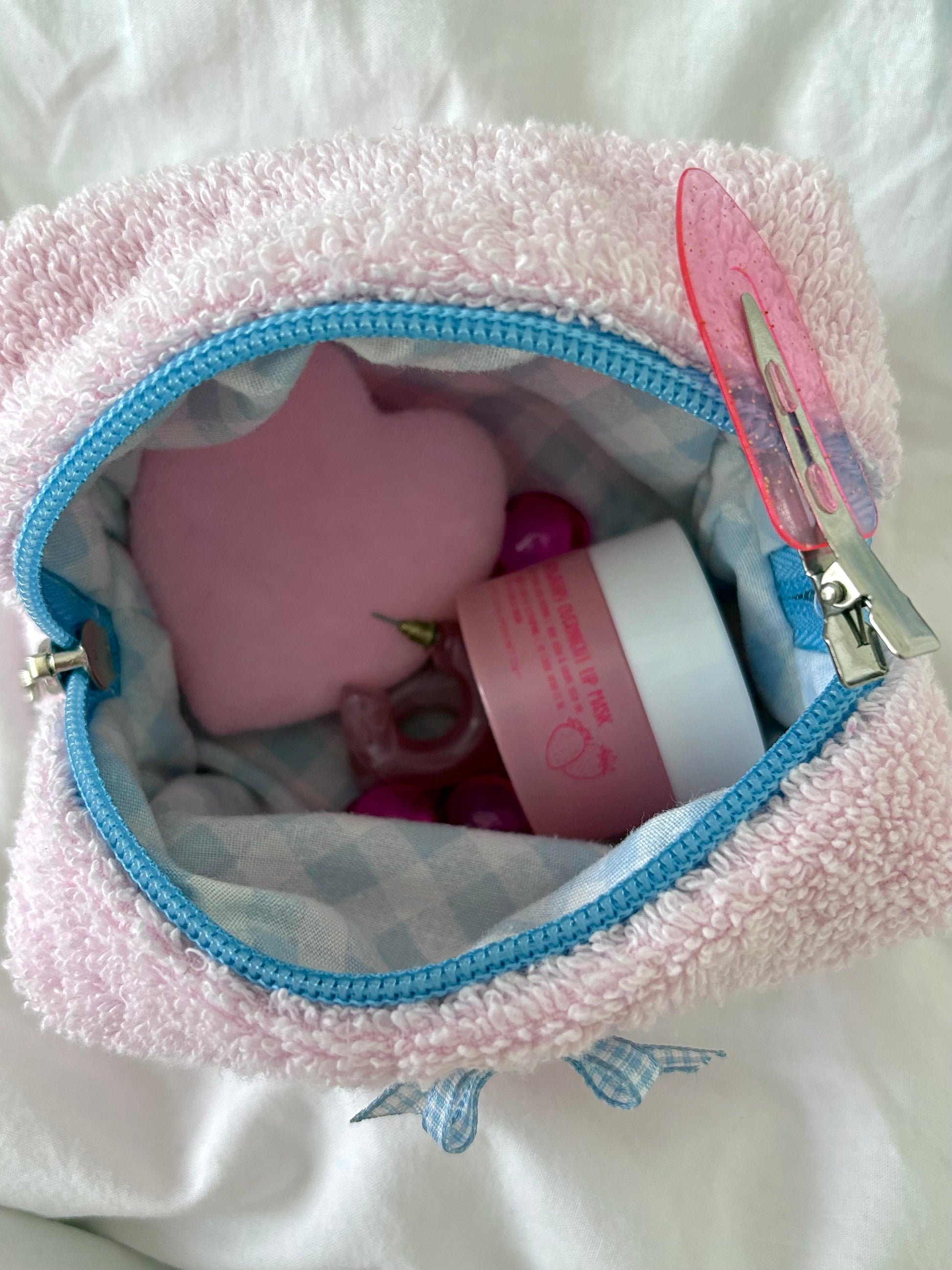 • Tissu : extérieur en éponge rose, doublure en vichy bleu ciel