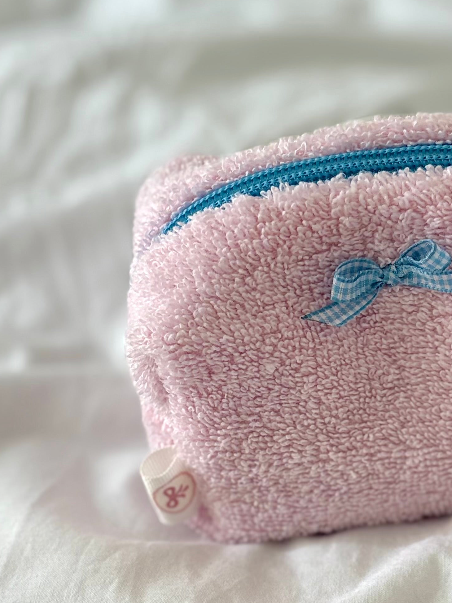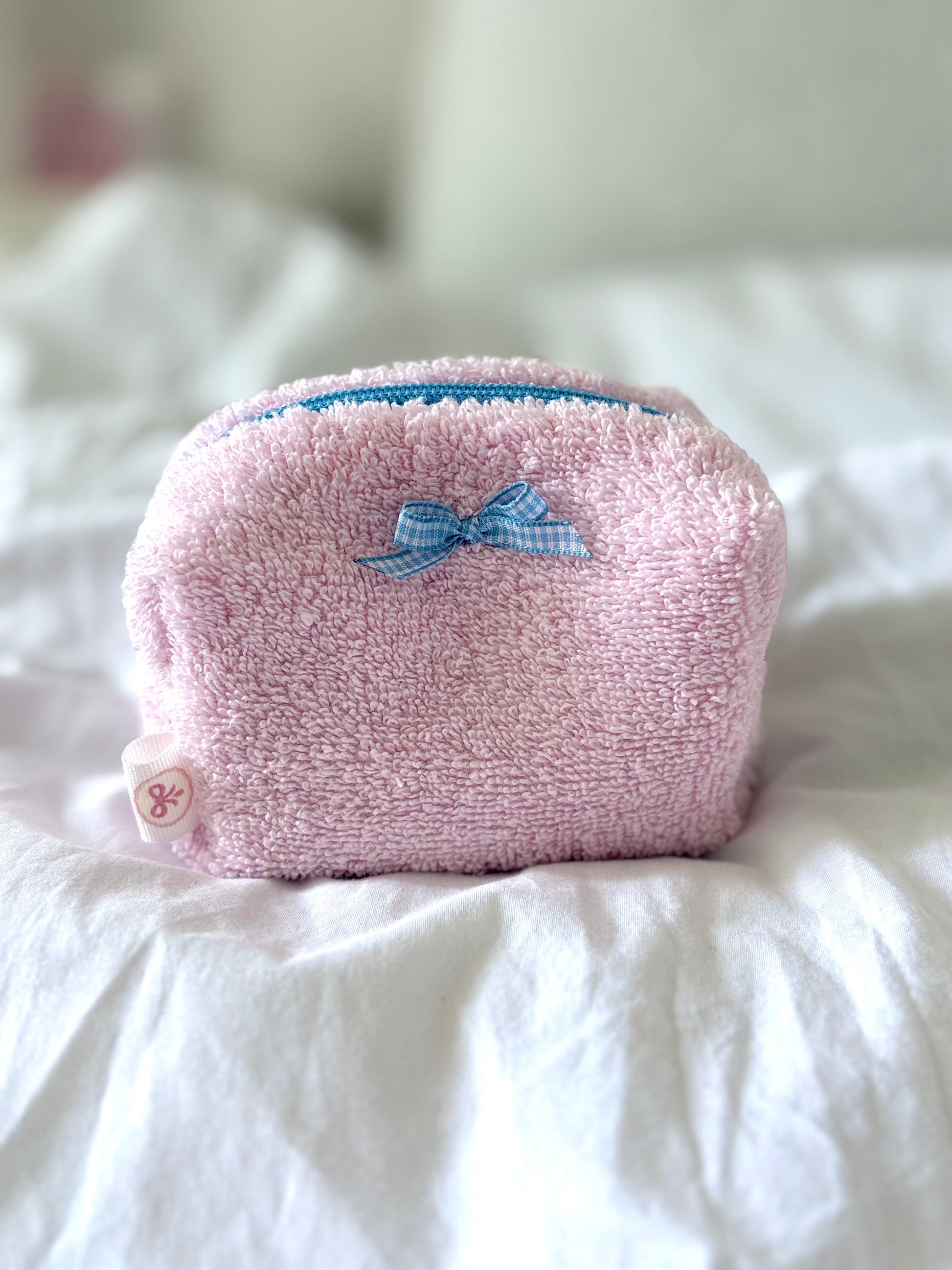 Le tissu éponge rose tendre contraste avec la doublure bleue pour un clin d’œil à la piscine, à l’insouciance et aux routines ensoleillées.