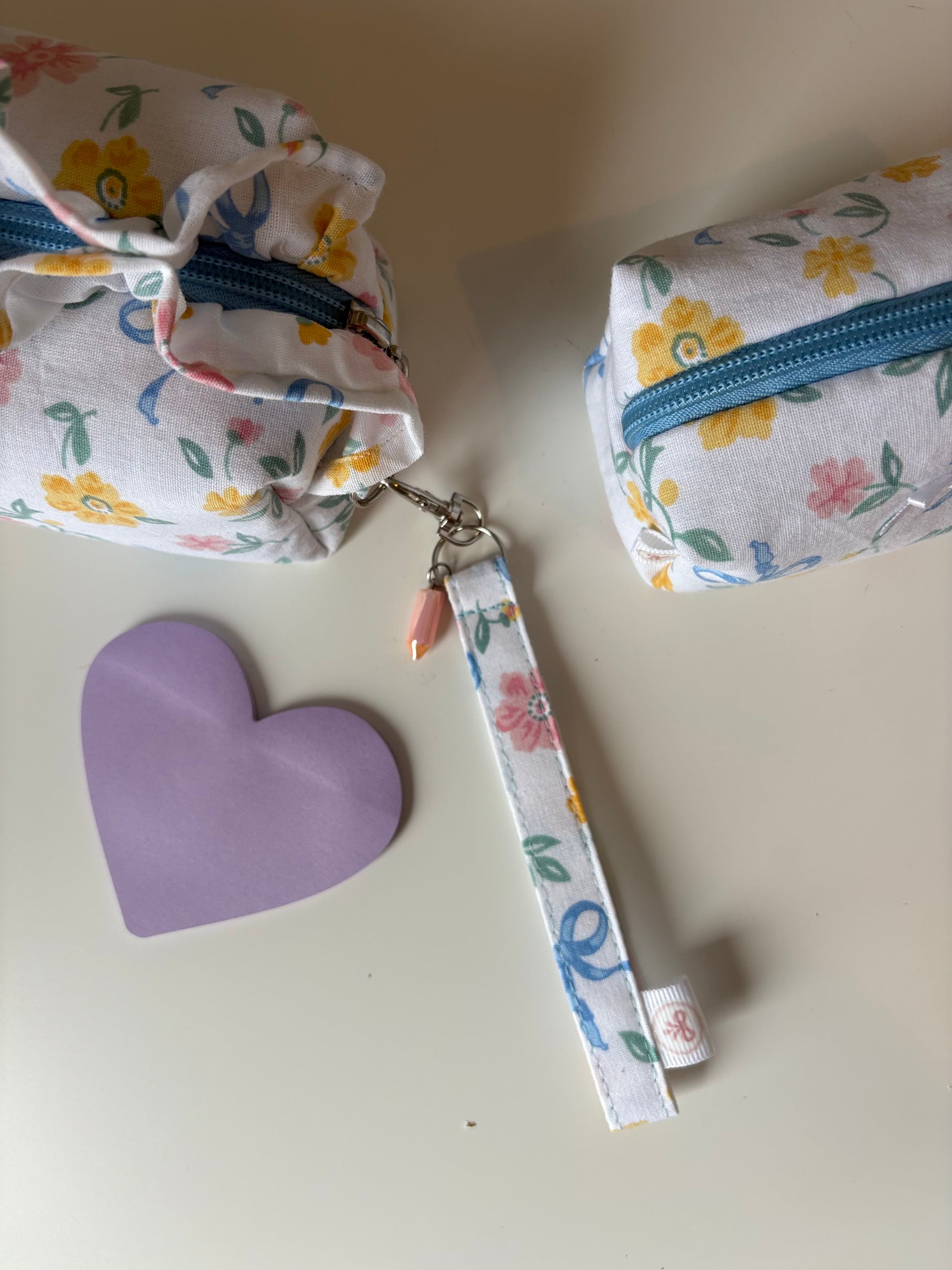 - Tissu : Study Bloom (fleurs roses & nœuds bleus sur fond crème)